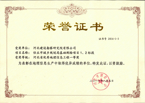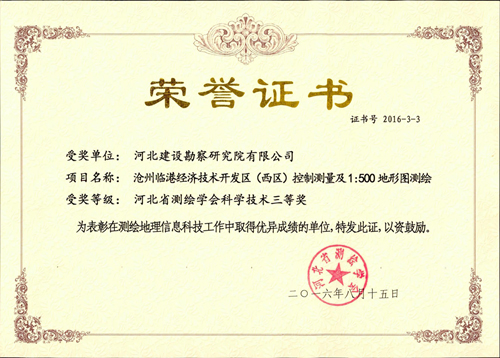 8月5日,我公司承擔(dān)的任丘市城鄉(xiāng)規(guī)劃局基礎(chǔ)測繪項目1、2標段被河北省測繪學(xué)會評為河北省優(yōu)秀地理信息工程一等獎;8月15日,我公司承擔(dān)的滄州臨港經(jīng)濟技術(shù)開發(fā)區(qū)(西區(qū))控制測量及1∶500地形圖測繪項目被河北省測繪學(xué)會評為河北省測繪學(xué)會科學(xué)技術(shù)三等獎。