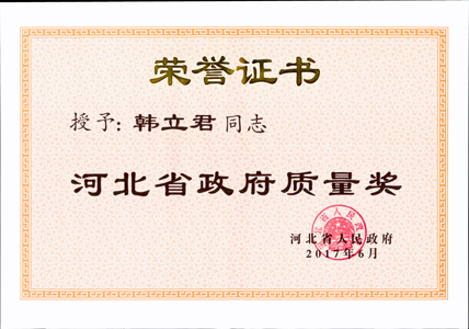 韓立君董事長榮獲河北省政府質量獎個人獎、公司獲組織提名獎
