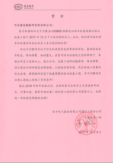 我公司承建的印尼卡爾滕2*100MW燃煤電站項目樁基荷載試驗與樁基工程于2017年12月7日夜間順利完工。東方電氣股份有限公司國際工程分公司發來賀信,向我公司項目員工表示祝賀。