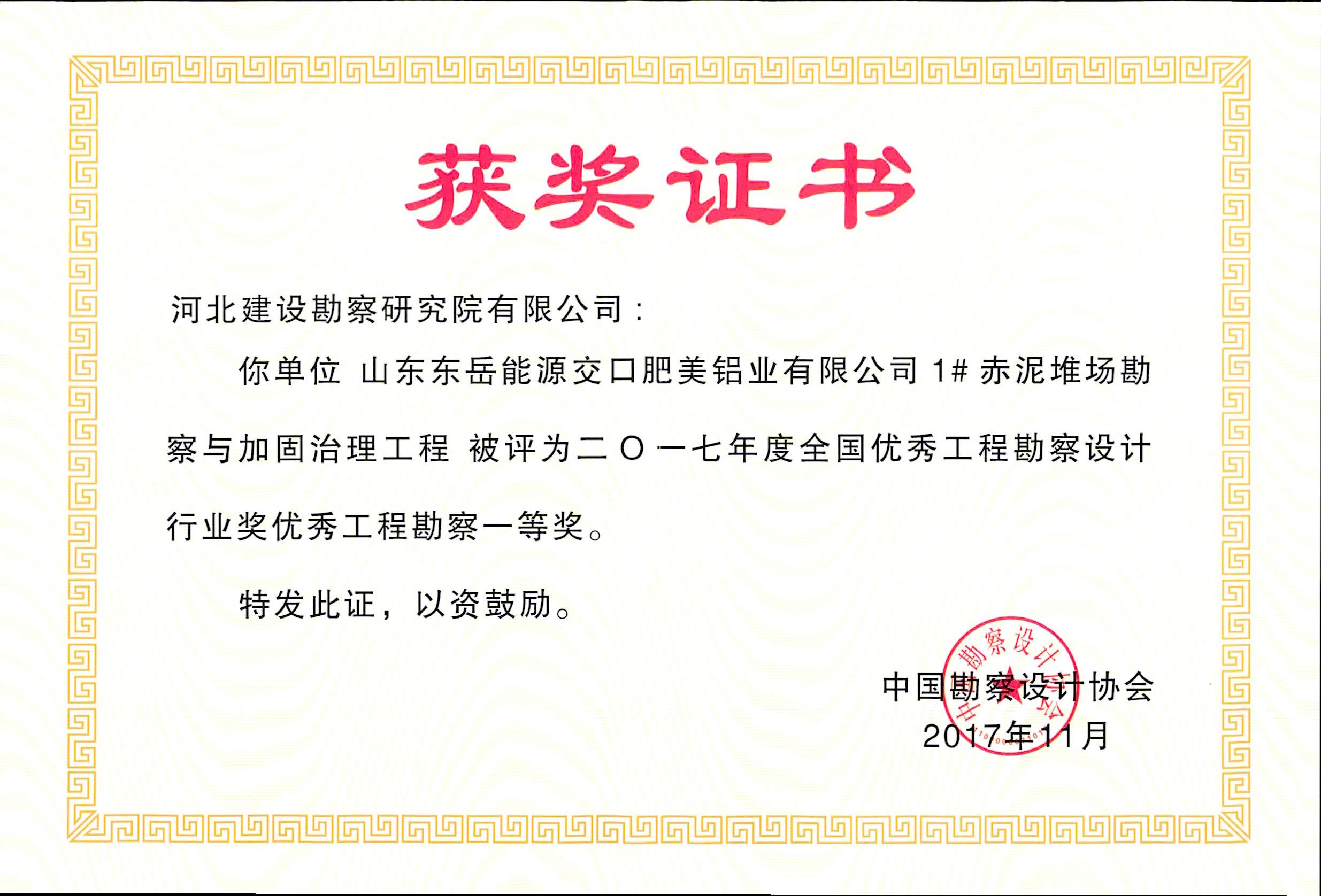 根據(jù)中國勘察設(shè)計協(xié)會2017年11月29日發(fā)布的中設(shè)協(xié)字【2017】85號文件《關(guān)于公布2017年度全國優(yōu)秀工程勘察設(shè)計行業(yè)獎評選結(jié)果的通知》,我公司兩項工程獲優(yōu)秀工程勘察獎。其中,山東東岳能源交口肥美鋁業(yè)有限公司1#赤泥堆場勘察與加固治理工程榮獲優(yōu)秀工程勘察一等獎,中海油粵東LNG項目接收站儲罐區(qū)巖土工程勘察榮獲優(yōu)秀工程勘察二等獎。