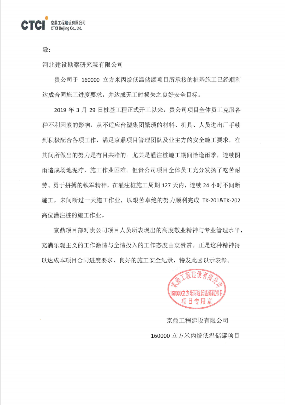 我公司承接的160000立方米丙烷低溫儲罐樁基施工工程,自開工以來,項目部全體員工克服各種不利因素的影響,經(jīng)過艱苦卓絕的不懈努力,已順利達成合同施工進度要求,并達成無工時損失之良好安全目標,滿足京鼎項目團隊及業(yè)主方的安全施工要求,已圓滿完成各項施工任務,順利完工。期間所表現(xiàn)出的高度敬業(yè)精神和專業(yè)管理水平,得到了業(yè)主和監(jiān)理的一致好評,近期特向我公司發(fā)函予以表揚。