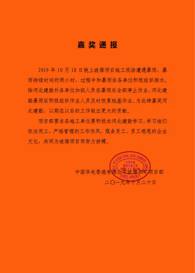 華電(印尼)玻雅項目部收到中國華電香港有限公司玻雅EPC項目部發來的嘉獎