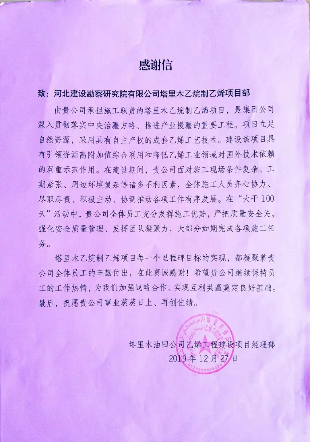 公司近日收到業(yè)主塔里木油田公司乙烯工程建設(shè)項(xiàng)目經(jīng)理部的感謝信及中國(guó)寰球工程有限公司北京分公司的質(zhì)量管理先進(jìn)集體錦旗。在建設(shè)期間,我公司面對(duì)現(xiàn)場(chǎng)條件復(fù)雜、工期緊張等諸多不利因素,全體施工人員齊心協(xié)力、盡職盡責(zé)、積極主動(dòng)、協(xié)調(diào)推動(dòng)各工作有序開展,在施工中,嚴(yán)把質(zhì)量安全觀、強(qiáng)化安全質(zhì)量管理、發(fā)揮團(tuán)隊(duì)凝聚力,很好的完成了各項(xiàng)施工任務(wù),為雙方進(jìn)一步加強(qiáng)戰(zhàn)略合作、實(shí)現(xiàn)互利共贏奠定了良好基礎(chǔ)。