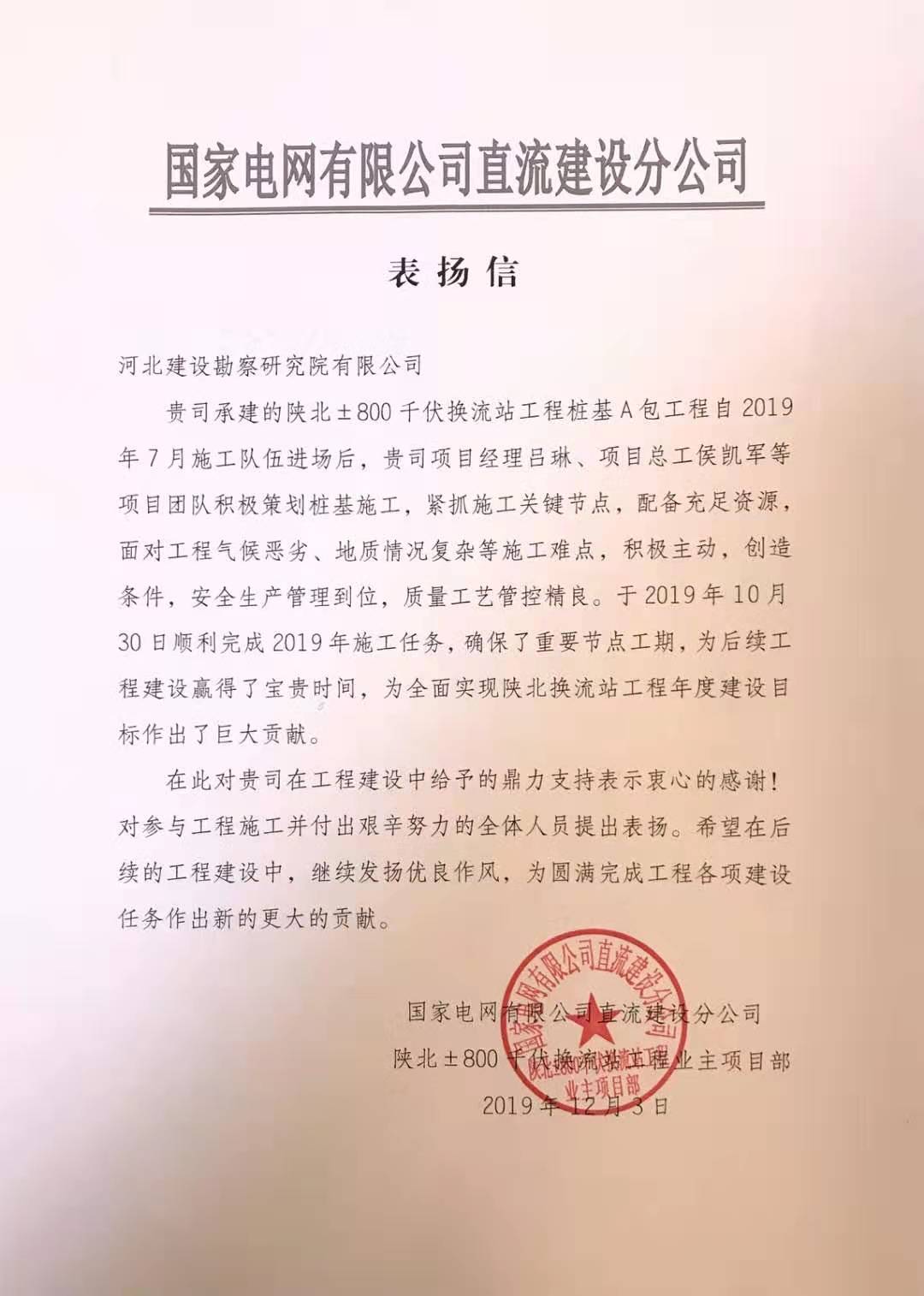 另有陜北換流站項(xiàng)目部也收到國(guó)家電網(wǎng)直流建設(shè)分公司的感謝信,該項(xiàng)目自2019年7月進(jìn)場(chǎng)后,在項(xiàng)目經(jīng)理呂琳、項(xiàng)目總工侯凱軍等精心組織和艱苦努力下,順利完成施工任務(wù),確保了重要節(jié)點(diǎn)工期,為后續(xù)工程建設(shè)贏得了寶貴時(shí)間,為全面實(shí)現(xiàn)陜北換流站工程年度建設(shè)目標(biāo)作出巨大貢獻(xiàn),受到業(yè)主的充分肯定和高度表揚(yáng)。