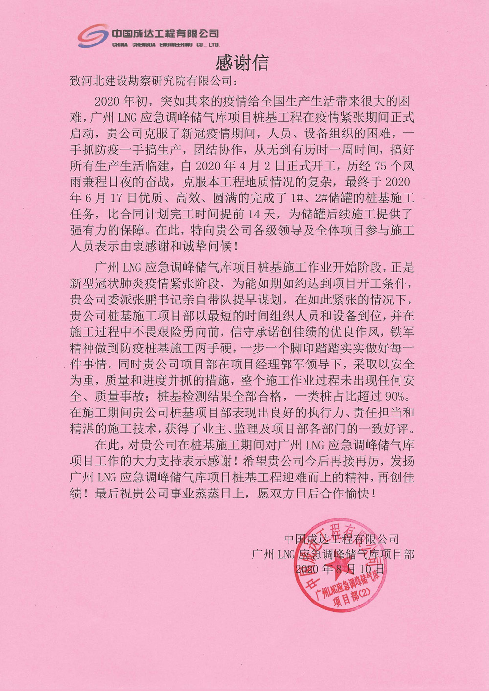 近日,我公司廣州LNG應急調峰儲氣庫項目收到成達公司發(fā)放的感謝信。廣州LNG應急調峰項目是我公司首次在LNG行業(yè)打入廣州市場,也是首次和中國成達工程公司進行合作,項目部全體員工發(fā)揚公司的鐵軍精神做到防疫施工兩手硬,不畏艱險勇向前,齊心協(xié)力、積極策劃,圓滿的完成了各項任務,為廣州LNG應急調峰項目順利實施打下良好的基礎;在施工中,項目安全生產(chǎn)管理到位,質量工藝管控優(yōu)良,贏得了業(yè)主、監(jiān)理及相關各方高度認可。對全體參建本項目的領導與員工表示了衷心的感謝,并希望在后續(xù)的工程建設中,繼續(xù)發(fā)揚河北建勘的優(yōu)良工作作風!