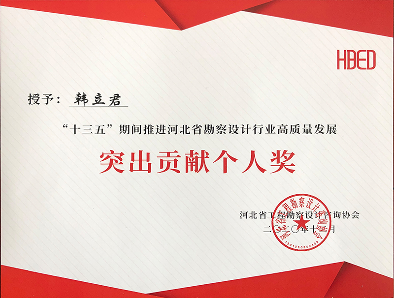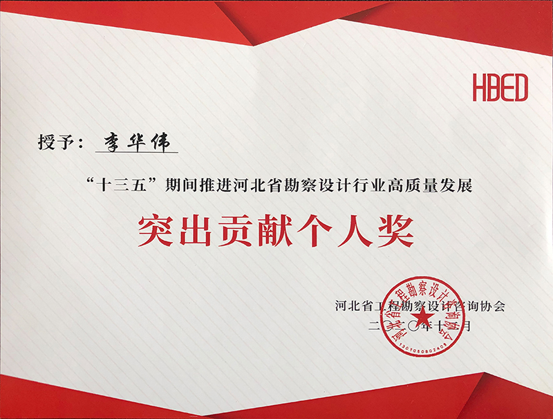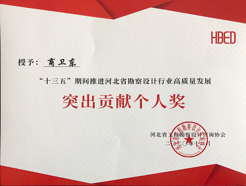 由河北省工程勘察設(shè)計咨詢協(xié)會評選,公司榮獲“十三五”期間推進(jìn)河北省勘察設(shè)計行業(yè)高質(zhì)量發(fā)展突出貢獻(xiàn)單位,韓立君董事長、李華偉總經(jīng)理、商衛(wèi)東主任榮獲“十三五”期間“推進(jìn)河北省勘察設(shè)計行業(yè)高質(zhì)量發(fā)展突出貢獻(xiàn)個人”。