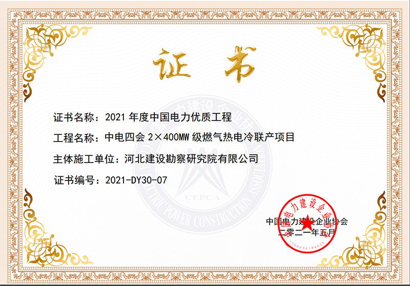 近日,中國電力建設企業協會公布了2021年度中國電力優質工程評審結果,我公司作為中電四會2×400MW級燃氣熱電冷聯產項目主體施工單位,榮獲2021年度中國電力行業優質工程獎。