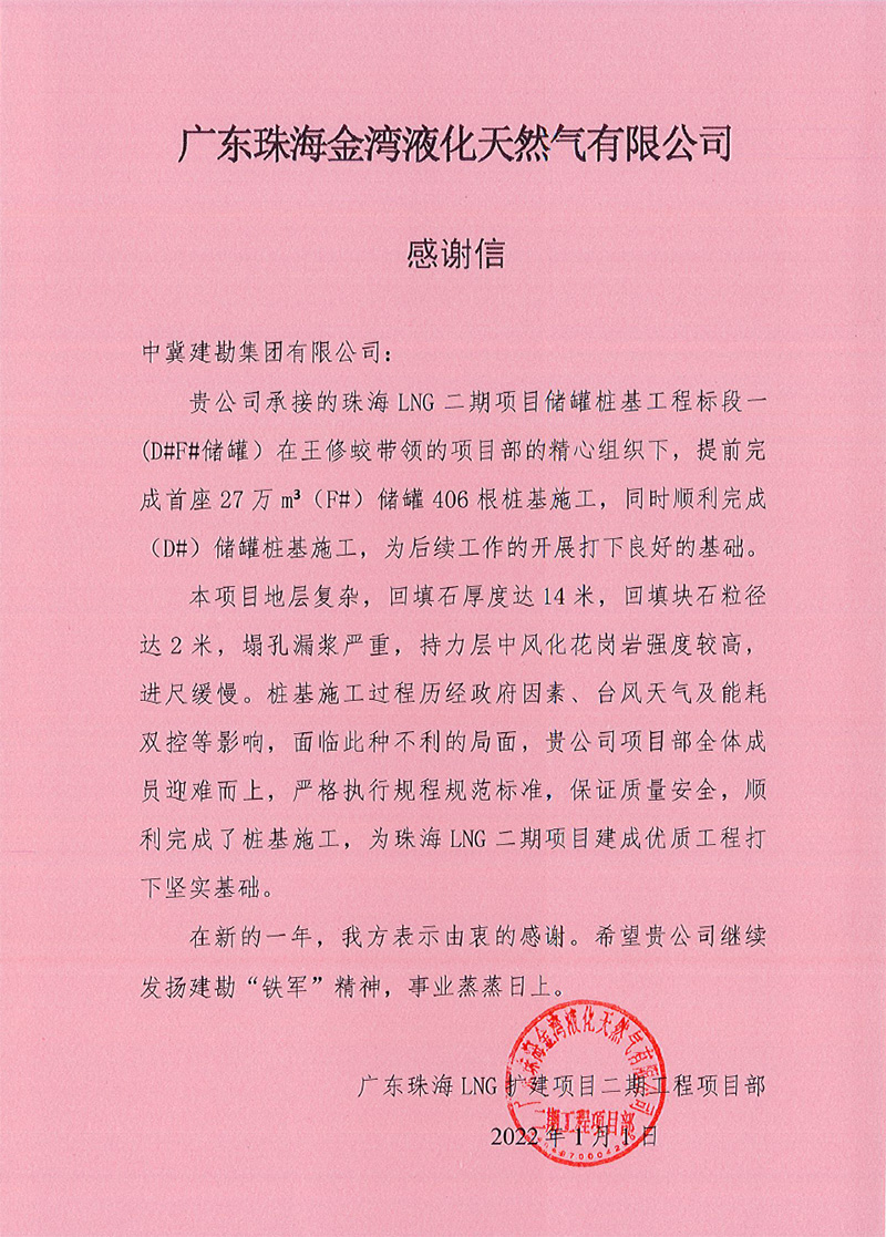 廣東珠海LNG二期項(xiàng)目27萬方儲(chǔ)罐是目前全球單罐容積最大的LNG儲(chǔ)罐,技術(shù)要求嚴(yán),施工難度大。在施工工過程中,全體項(xiàng)目人員發(fā)揚(yáng)眾志成城、團(tuán)結(jié)奮戰(zhàn)的頑強(qiáng)精神,面對(duì)施工現(xiàn)場地質(zhì)情況復(fù)雜、工期緊、疫情防控、臺(tái)風(fēng)“查帕卡”、“獅子山”、“圓規(guī)”、“雷伊”的侵襲、高溫酷暑等不利因素,迎難而上,頑強(qiáng)奮戰(zhàn),保質(zhì)、安全、高效地履行合同任務(wù),確保了項(xiàng)目樁基節(jié)點(diǎn)的順利完成,為珠海LNG二期項(xiàng)目建成優(yōu)質(zhì)工程打好堅(jiān)實(shí)基礎(chǔ),為項(xiàng)目百萬安全工時(shí)無事故的實(shí)現(xiàn)做出了突出貢獻(xiàn),受到業(yè)主及總包方的高度贊揚(yáng)。