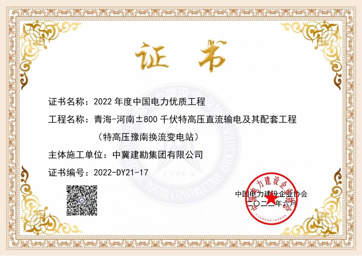 近日,中國電力建設企業協會公布了2022年度中國電力優質工程評審結果,我公司作為青海-河南±800千伏特高壓直流輸電及配套工程(特高壓豫南換流變電站)樁基施工單位,榮獲2022年度中國電力行業優質工程獎。“中國電力優質工程獎”是我國電力建設行業工程質量的最高榮譽,公司獲此殊榮,充分彰顯了我公司在行業內雄厚的綜合實力,樹立中冀建勘在電力行業的良好企業形象。