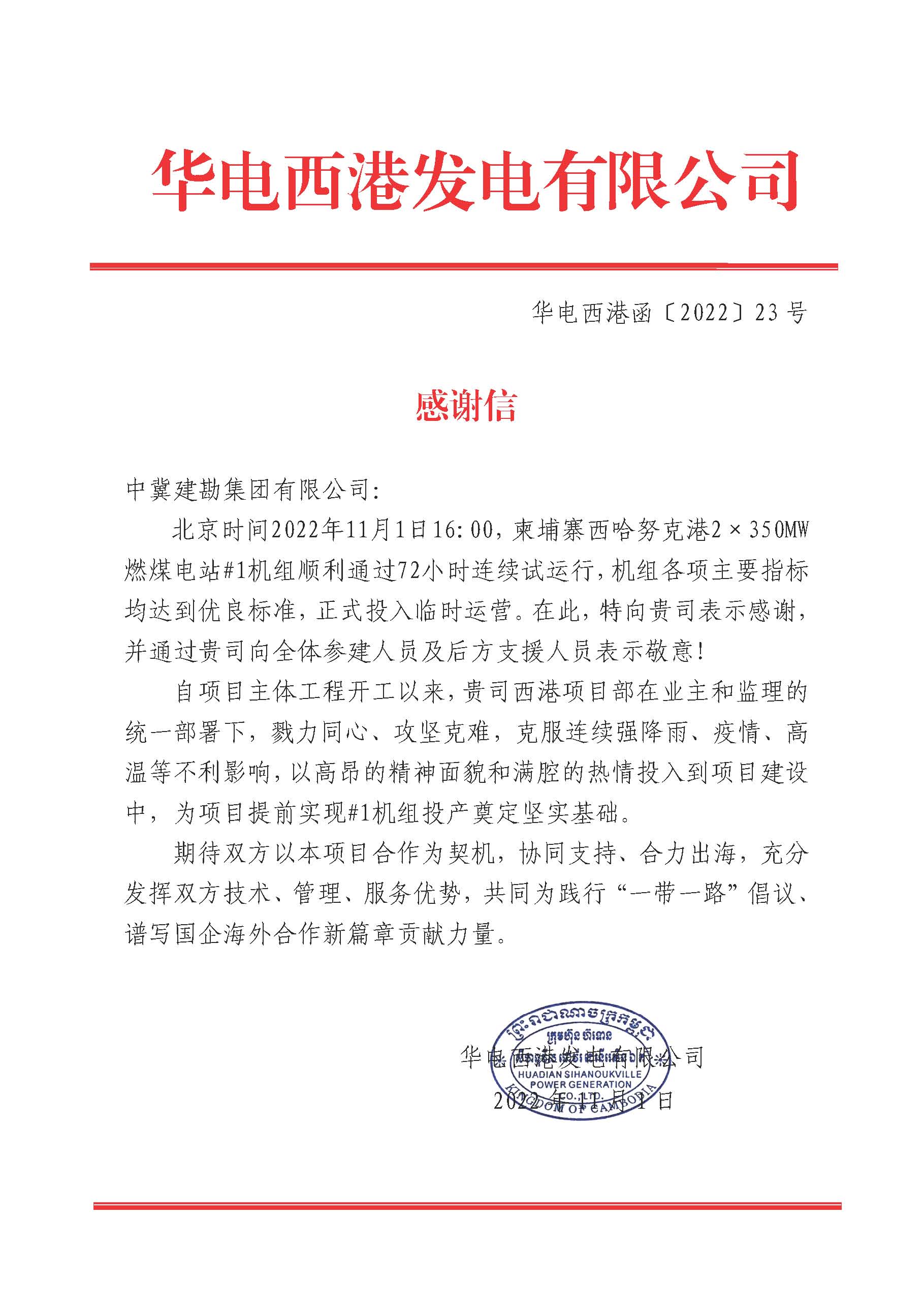 北京時間2022年11月1日16:00,由我公司承建的柬埔寨西哈努克港2×350MW燃煤電站#1機組順利通過柬埔寨國家電力公司要求的滿負荷性能試驗,標志著中國華電在柬投資興建的最大火電項目首臺機組正式投產發電。該項目是中國華電在“一帶一路”沿線國家投資建設的重點工程,也是目前中國在柬單體投資最大電源項目。業主華電西港發電有限公司特向我公司表示感謝,并對我公司全體參建人員及后方支持人員表示敬意!