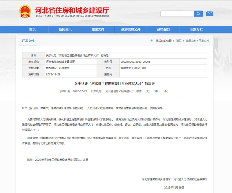 為貫徹落實人才強冀戰略,強化我省工程勘察設計隊伍建設和人才競爭能力,充分發揮行業頂尖人才的示范引領作用,近日,河北省住房和城鄉建設廳、河北省人力資源和社會保障廳聯合印發《關于認定“河北省工程勘察設計行業領軍人才”的決定》,我公司梁書奇同志被認定為“河北省工程勘察設計行業領軍人才”。