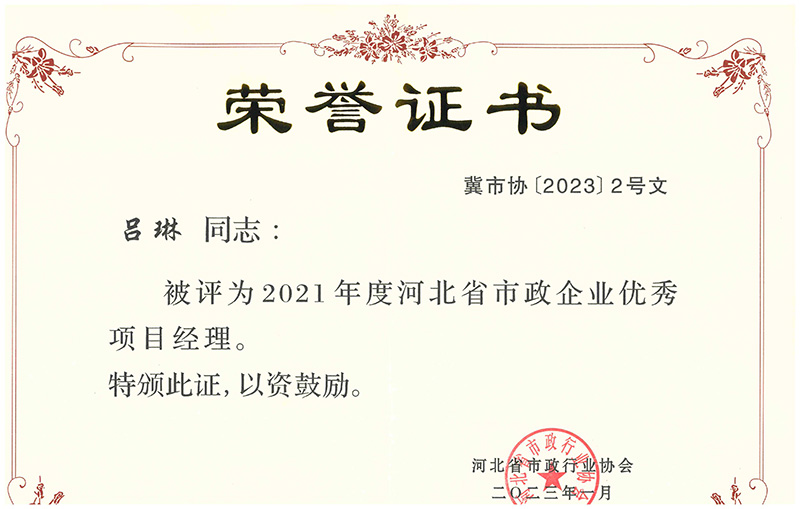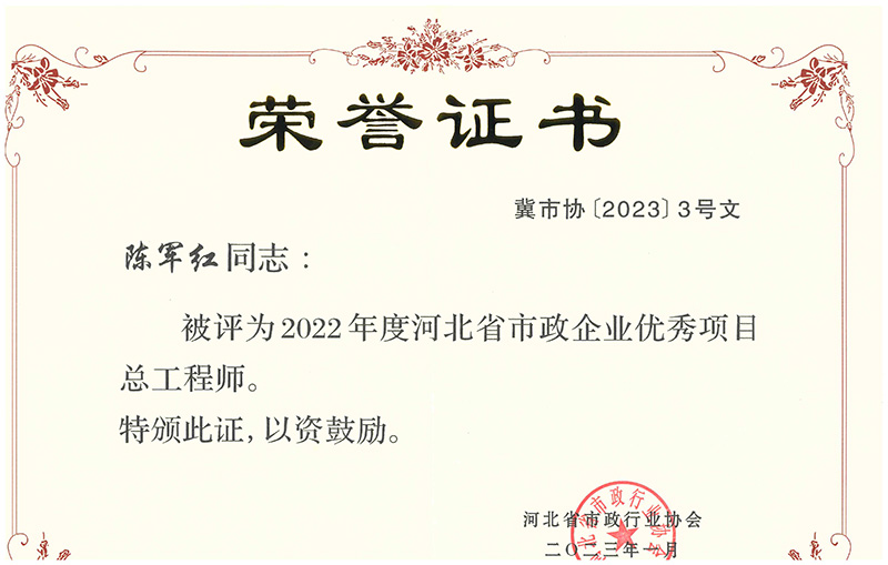 近日,經河北省市政行業協會組織選拔并發文公布,我公司王慶軍同志、呂琳同志榮獲 “2021年度河北省市政企業優秀項目經理” 榮譽稱號;陳軍紅同志、張樹楹同志榮獲“2022年度河北省市政企業優秀項目總工程師”榮譽稱號。