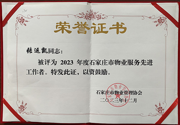 中冀建勘物業服務有限公司榮獲“2023 年度石家莊市物業管理先進單位”和“2023年度石家莊市物業服務先進單位”兩項榮譽稱號,張運凱同志榮獲“物業服務先進工作者”榮譽稱號。