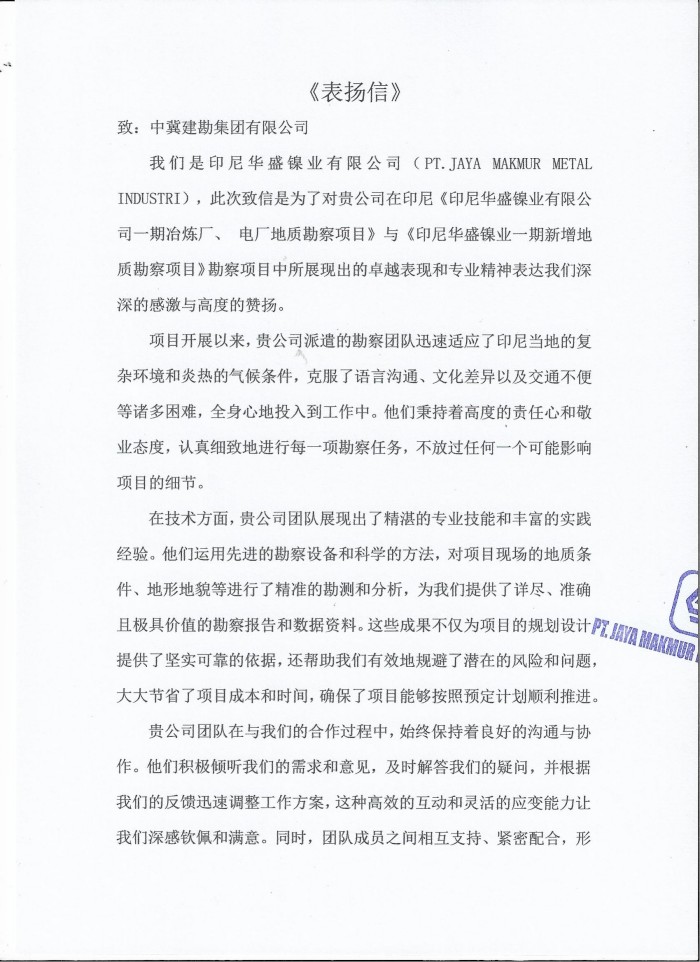印尼華盛鎳業有限公司發來了表揚信。在印尼華盛鎳業有限公司一期冶煉廠、電廠地質勘察項目及印尼華盛-年產200萬噸綜合鋼鐵項目的勘察任務中,印尼華盛勘察項目部全體職工迅速適應印尼當地的復雜環境和炎熱的氣候條件,克服了語言溝通、文化差異以及交通不便等諸多困難,全身心地投入到工作中。在項目實施過程中,嚴格遵守印尼當地的法律法規和安全環保要求,采取了一系列有效的安全保障措施,確保了勘察工作的安全有序進行。這種高度的專業素養和社會責任感,贏得了業主方的高度贊揚和深深感激。