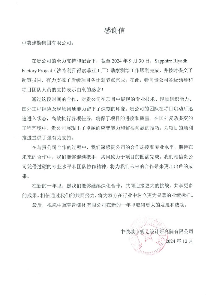 中鐵城市規劃設計研究院有限公司發來表揚信,對在我公司全力支持和配合下,順利完成沙特利亞德索菲亞工廠勘察測繪工作,并按時提交了勘察報告,有力支撐了后續項目各計劃節點完成,向我公司及項目團隊表示由衷感謝。