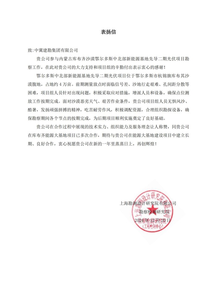 此外,我公司參與的新疆農六師鋁業CFG樁項目、內蒙古庫布齊沙漠鄂爾多斯中北部新能源基地光伏項目、深能保定西北郊熱電廠樁基礎工程等多個國內外項目收到業主單位表揚信,對我公司在項目中的高效執行、嚴謹管理和出色的團隊協作表示衷心感謝,并希望未來繼續與我公司保持緊密合作。