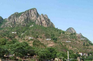 磁縣陶泉鄉(xiāng)南王莊位于冀西南群山之中。近年來(lái),北側(cè)“道士帽”山峰下曾發(fā)生過(guò)巖石崩落,造成一處民宅被砸,威脅約20余戶居民。隨著時(shí)間的推移,在各種地質(zhì)作用下,尤其是降水、凍融的影響,存在著繼續(xù)發(fā)生崩塌的隱患。為了村民的生命、財(cái)產(chǎn)安全,達(dá)到防災(zāi)減災(zāi)的目的,受磁縣國(guó)土資源局的委托,我公司進(jìn)行了崩塌治理勘察工作。